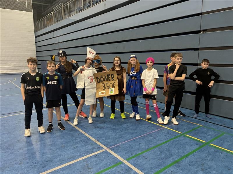 An weiteren Stationen konnten die Klassenteams ihre Koordination, Treffsicherheit und Ausdauer unter Beweis stellen. Bei dem Spiel Hühnerleiter war eine gute Spielübersicht entscheidend. Bei den Korbwürfen kam es auf Konzentration und Zielgenauigkeit an und in der Laufstaffel zeigte sich, welches Team besonders ausdauernd und geschickt zusammenarbeitete. Begleitet von Karnevalsmusik herrschte in der gesamten Halle eine ausgelassene Stimmung. Zahlreiche Schülerinnen und Schüler kamen in ideenreichen und liebevoll gestalteten Kostümen und verliehen der Veranstaltung damit eine besonders farbenfrohe und fröhliche Atmosphäre. Am Ende des gelungenen Tags wurde das coolste Karnevalskostüm mit einem riesigen Klatschapplaus gekrönt. Ein besonderer Dank gilt unseren Sportlehrkräften und Sporthelfern, die die Organisation und Durchführung dieses Tages ermöglicht haben. Ebenso bedanken wir uns herzlich bei der Schwalbe Arena, dass wir unser Sport- und Spielefest erneut dort veranstalten durften.