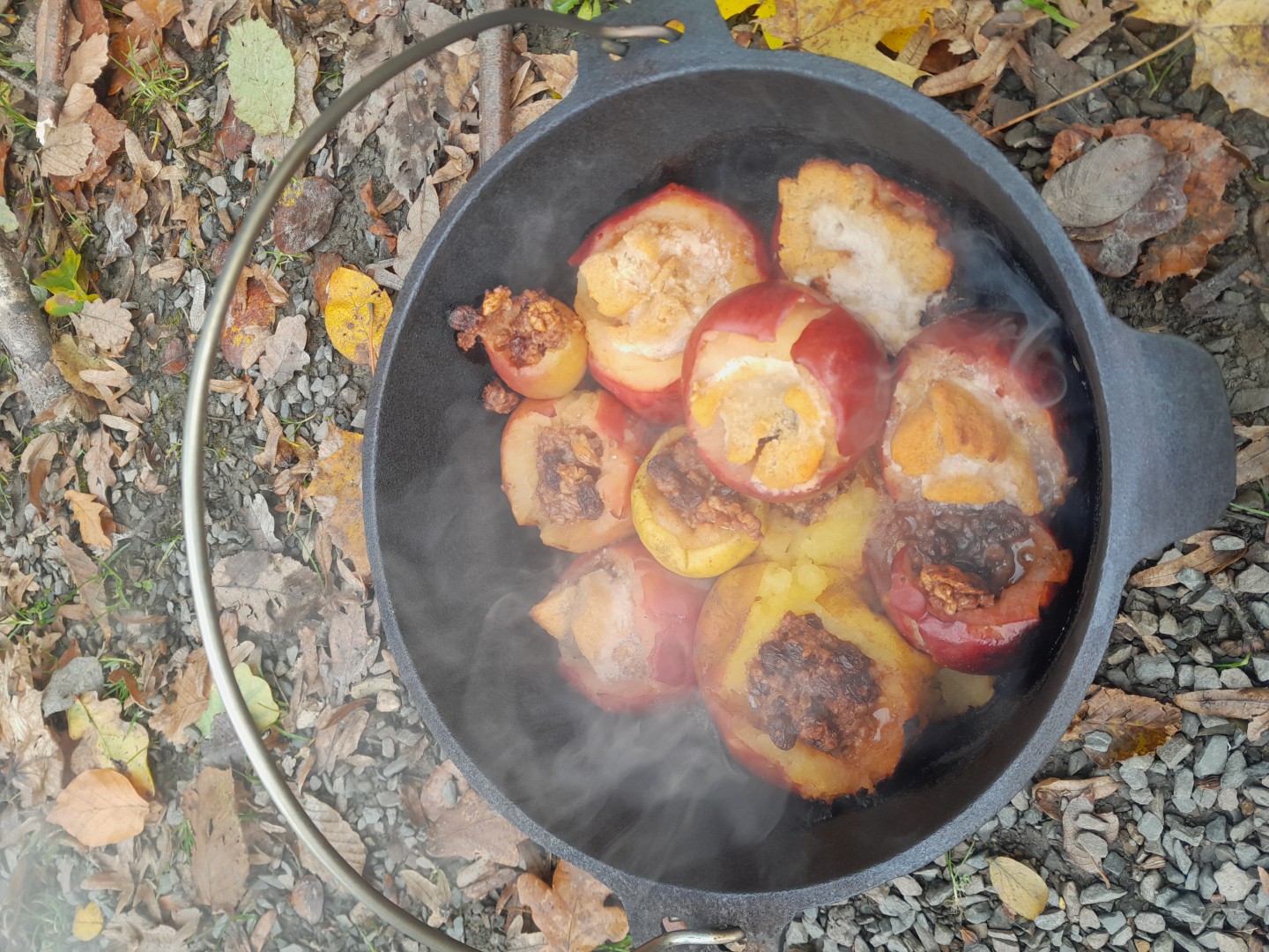 Zurück an der Biologischen Station machten wir uns daran, die Äpfel zu reinigen, auszuhöhlen und mit einer Füllung aus Nüssen, Rosinen und Marzipan zu versehen. Anschließend stellten wir die Bratäpfel mit einem Römertopf in die Glut des Feuers. Während die Äpfel vor sich hin schmorten, machten wir uns daran, in der Küche der Biologischen Station eine Vanillesoße zu machen. Bereits nach kurzer zeit waren die Äpfel durchgeschmort und wir konnten sie mit der Vanillesoße zusammen, gemeinsam verzehren.
