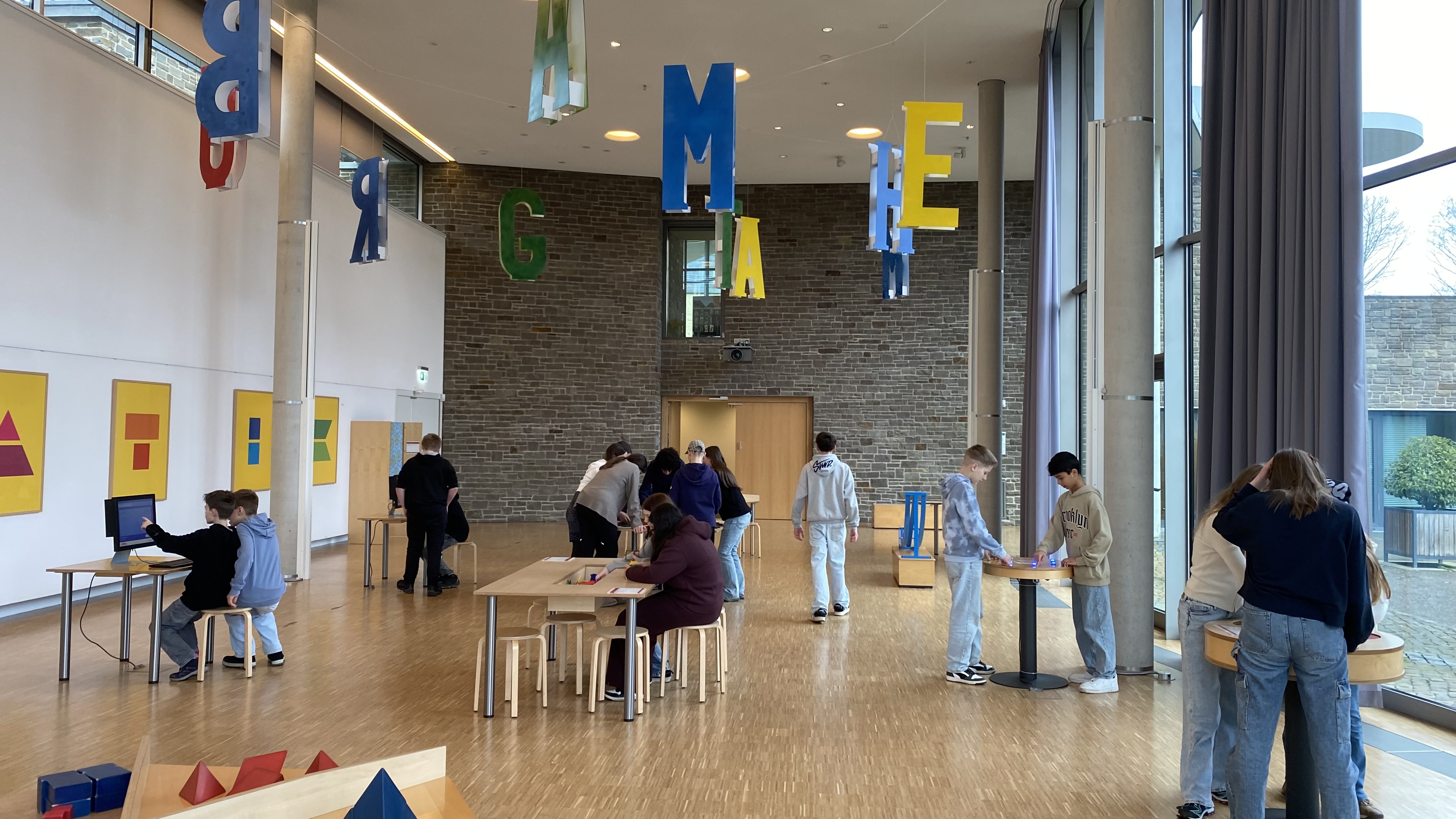 Schon beim Betreten wurden die Schüler von einer farbenfrohen und spielerischen Atmosphäre empfangen, die sofort Neugier weckte. Die interaktiven Stationen boten eine beeindruckende Vielfalt mathematischer Phänomene auf anschauliche und oft überraschende Weise. Besonders viel Feingefühl war beim Nachzeichnen von Funktionen gefragt, bei dem man sich auf einem Teppich zwischen den Zahlen 0 und 4 bewegen musste.