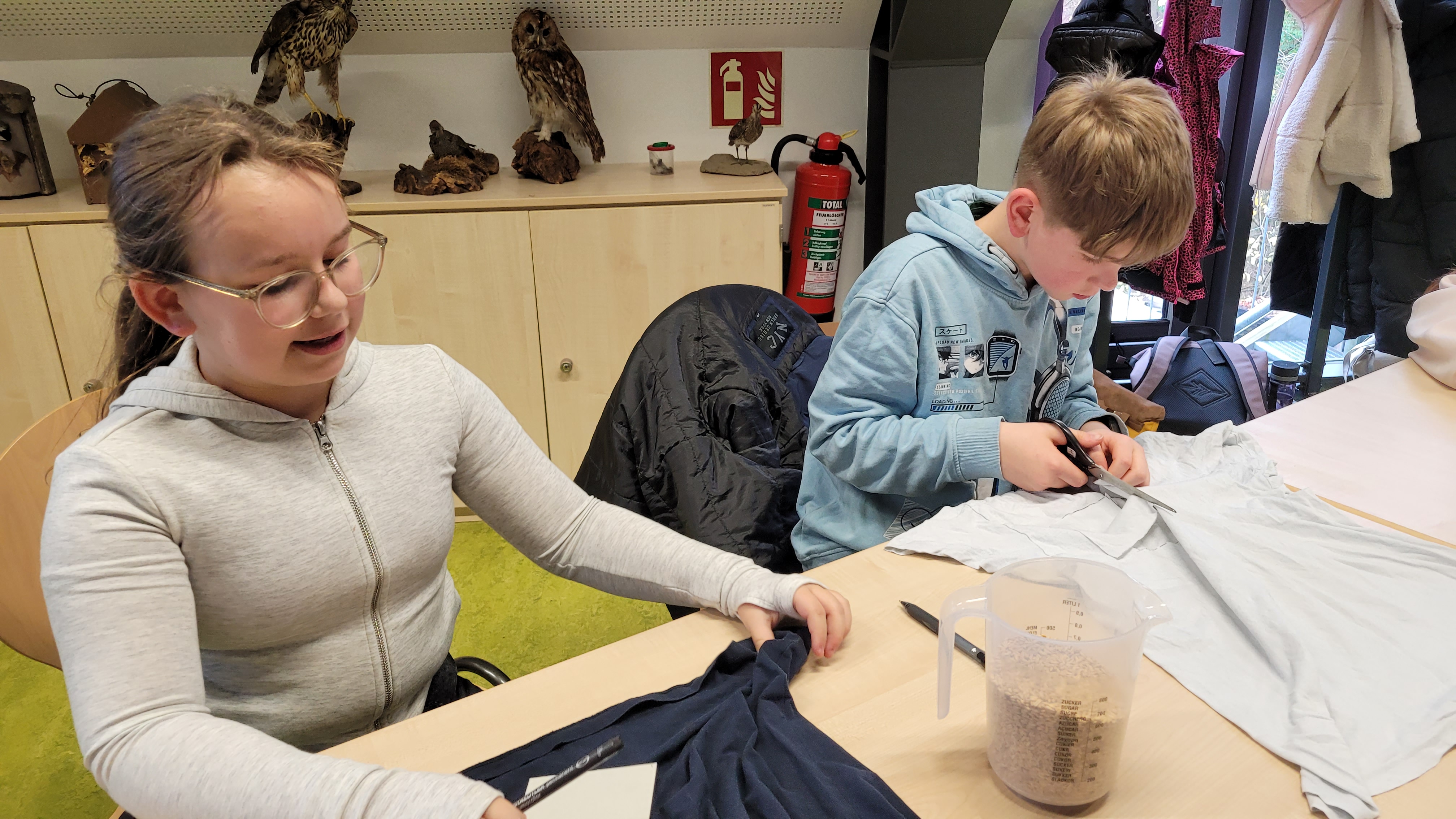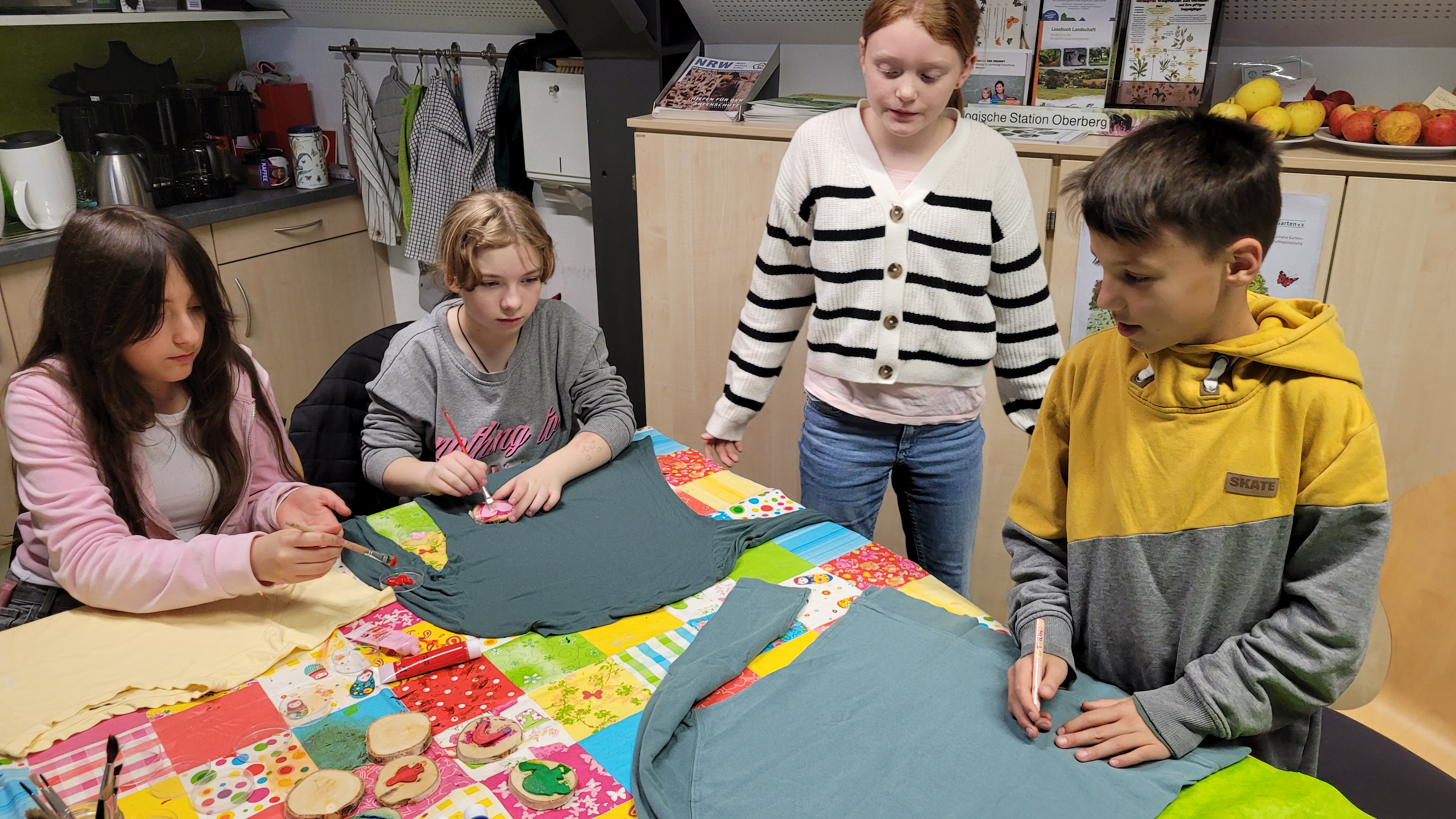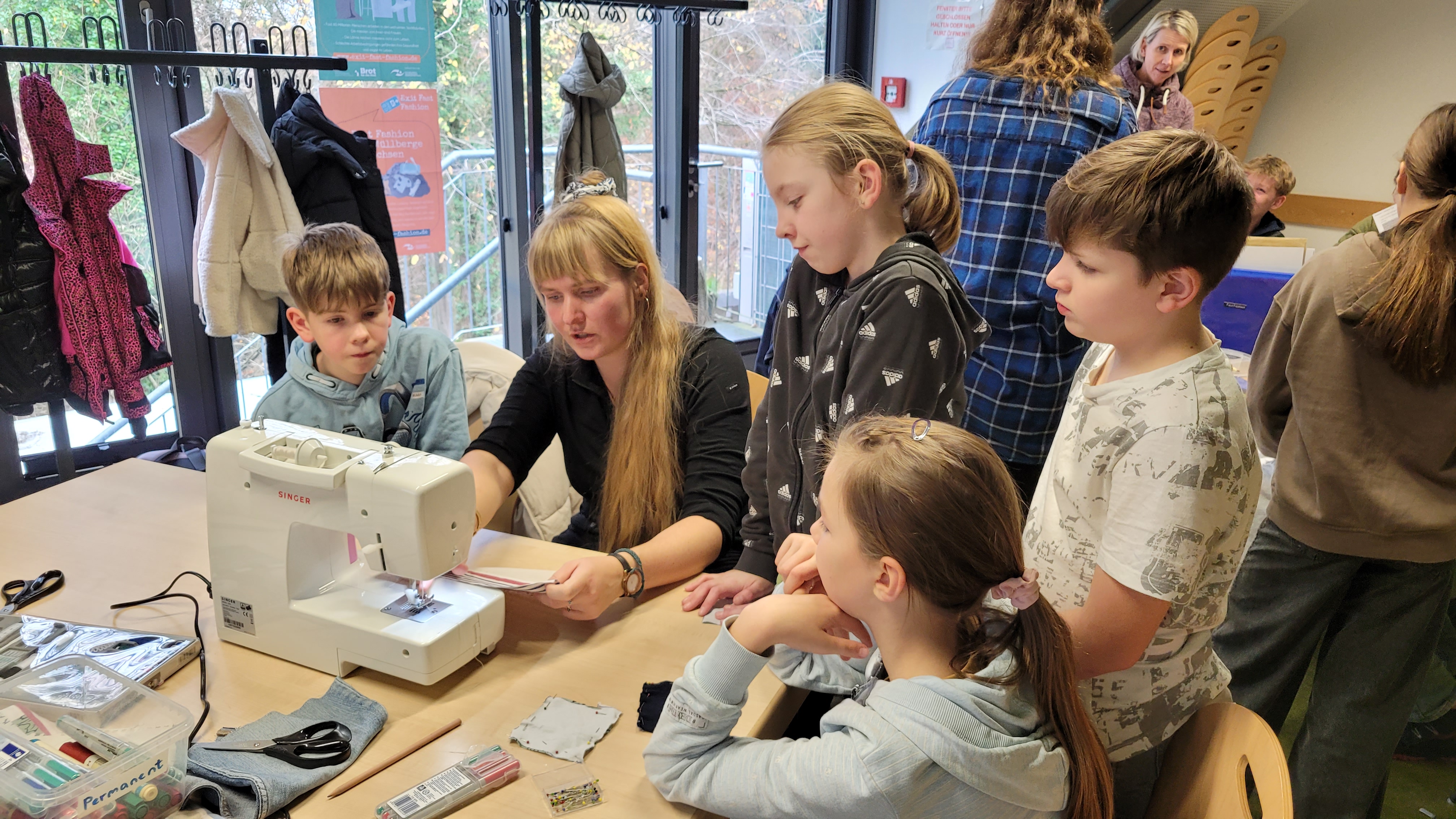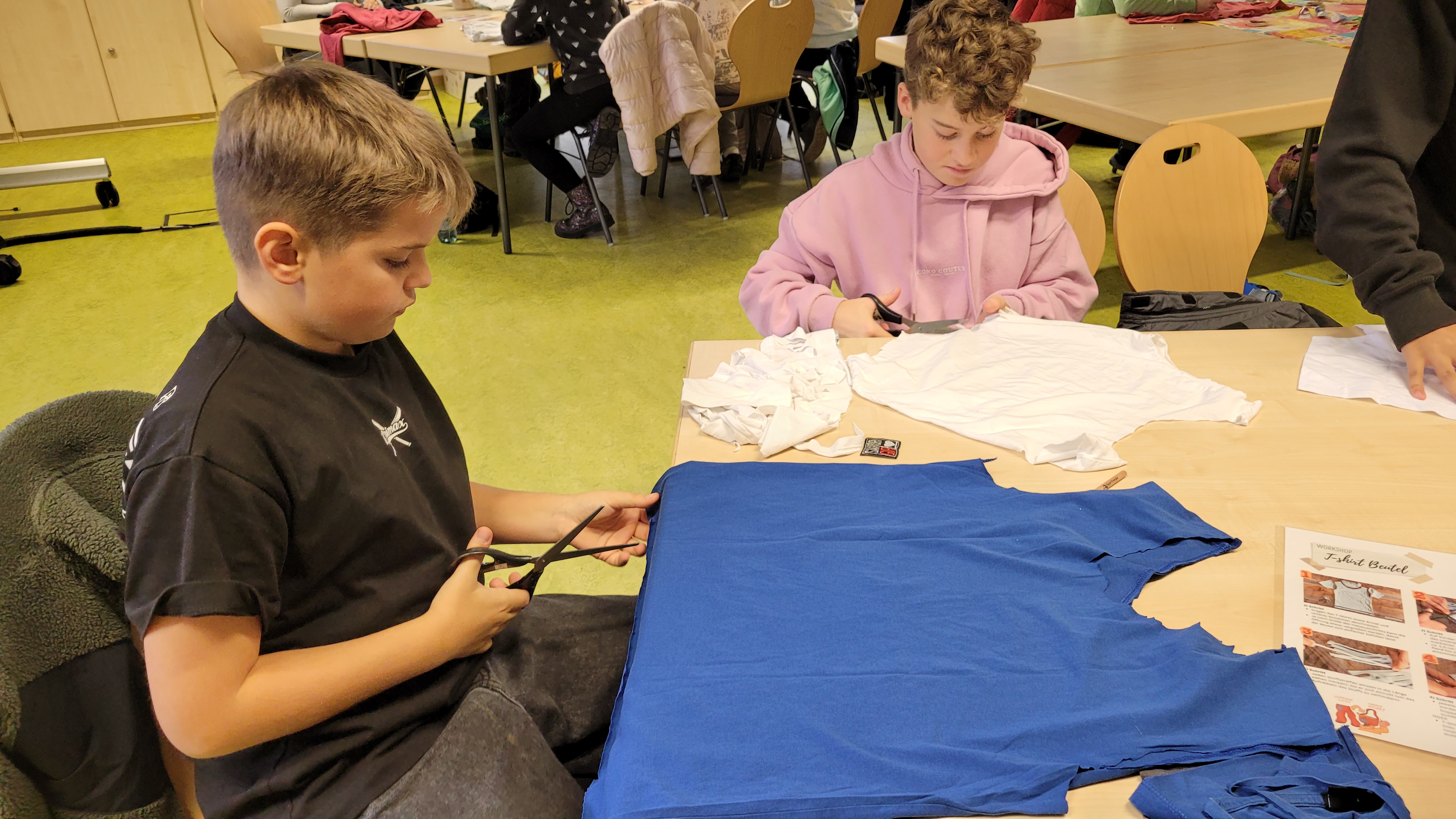 So hieß das Angebot des Landschafts-Hauses, das die Klasse 6A am 10. November in Nümbrecht besuchte. Nachdem wir mit dem Bus abgeholt worden waren, versammelte sich die Klasse in den Räumlichkeiten des „roten Hauses“, um dort zu lernen, wie, wo und unter welchen Bedingungen unsere Kleidung hergestellt wird. So erfuhren die Kinder zum Beispiel im Rahmen einer Black Story, welche negativen Auswirkungen der enorme Anbau von Baumwolle auf den Aralsee hat. Im Rahmen eines Vortrags hörten sie unter anderem, wie viele Kilometer ein T-Shirt hinter sich hat, bevor es getragen wird. Das Highlight war aber das Upcyceln ihrer mitgebrachten T-Shirts, bei dem die Kinder besonders viel Spaß hatten. Hier wurde gestickt, bedruckt, aufgebügelt und genäht, so dass die Kinder anschließend alle ihre „Designerstücke“ mit nach Hause nehmen konnten.