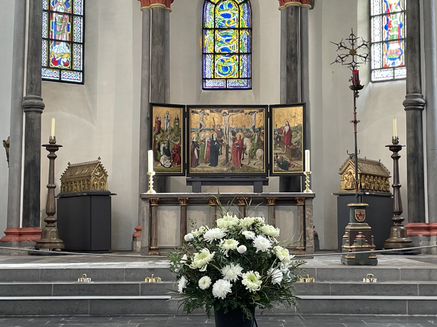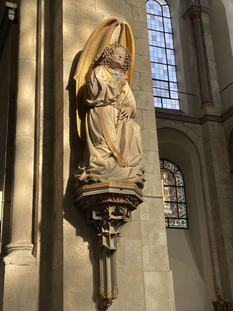 Vor dem Ausstellungsbesuch erkundete der Kurs die nahegelegene romanische Basilika St. Kunibert. Beeindruckend waren die Heiligenbilder und Statuen, darunter Darstellungen der heiligen Ursula und Cordula in einem Apsisfenster sowie eine Statue des heiligen Klemens.