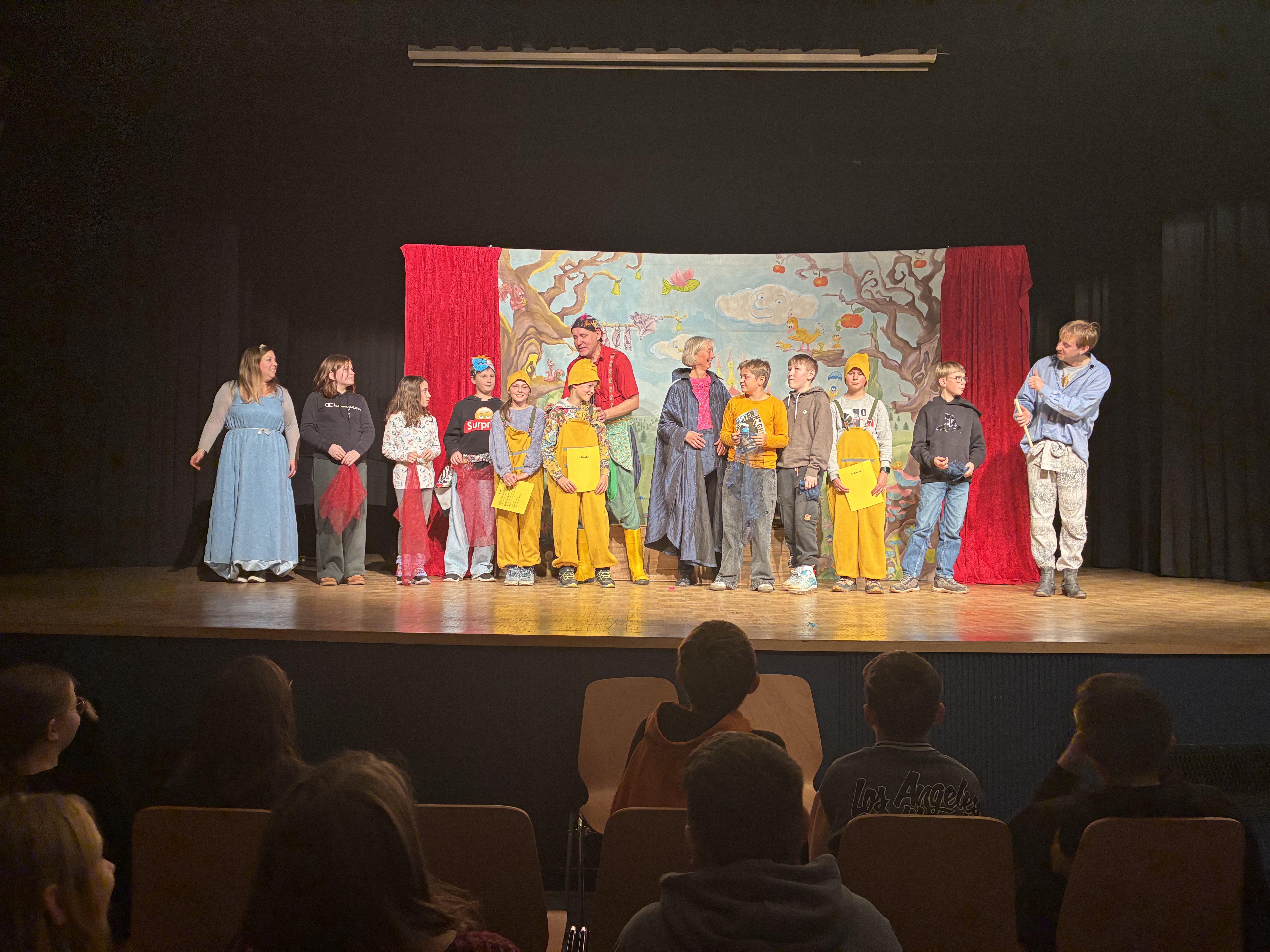 Das Publikum wurde aktiv einbezogen: Papageno und Tamino verließen die Bühne, um Kontakt aufzunehmen. Frau Schriegel übernahm spontan die Rolle der Königin der Nacht. Schüler der 5. und 6. Klassen wirkten als die drei Knaben, mit gelben Zipfelmützen und Latzhosen, oder stellten mit Chiffontüchern in einer Bewegungsgestaltung Feuer und Wasser dar. Sie trugen auch ihre im Musik- und Kunstunterricht gestalteten Tiermasken.